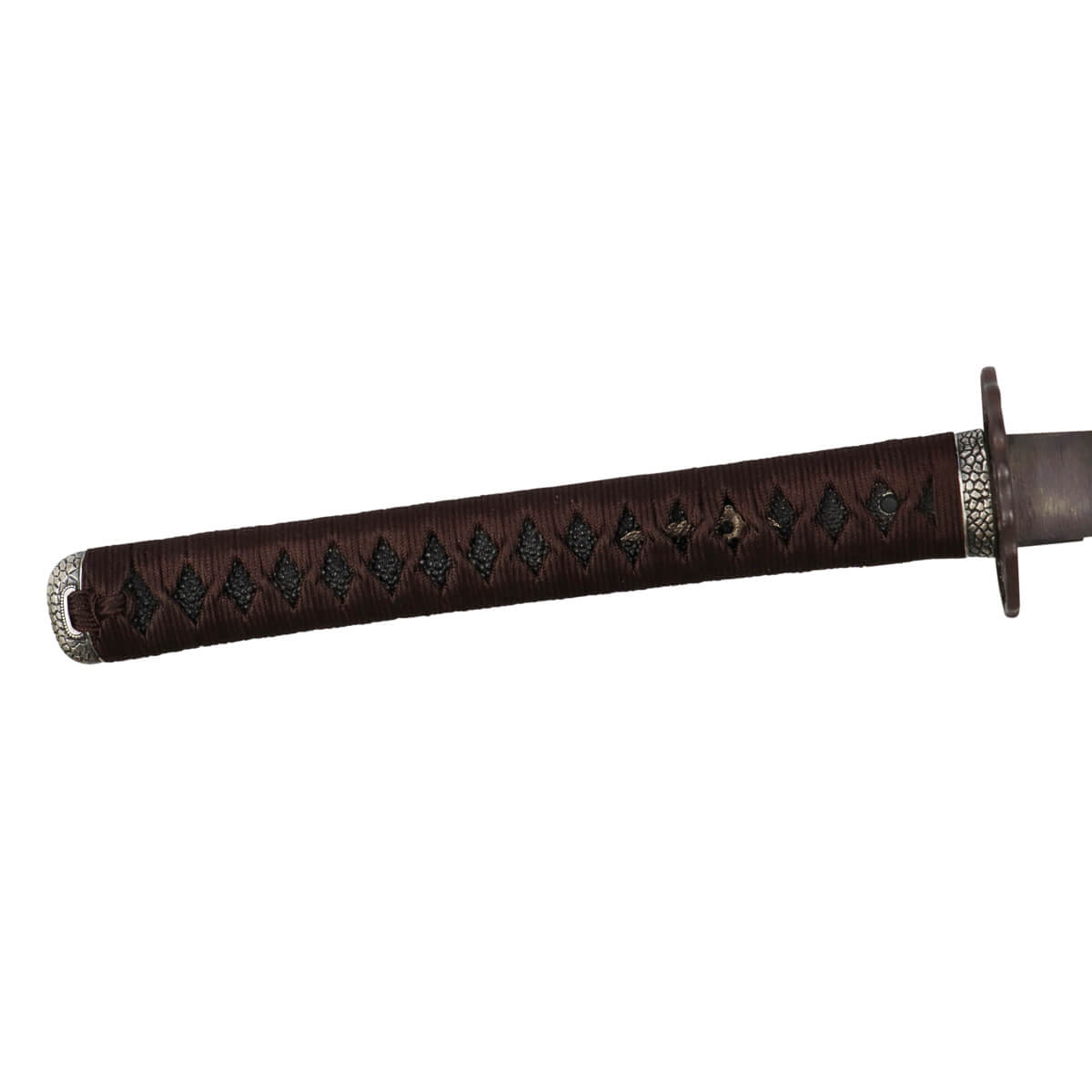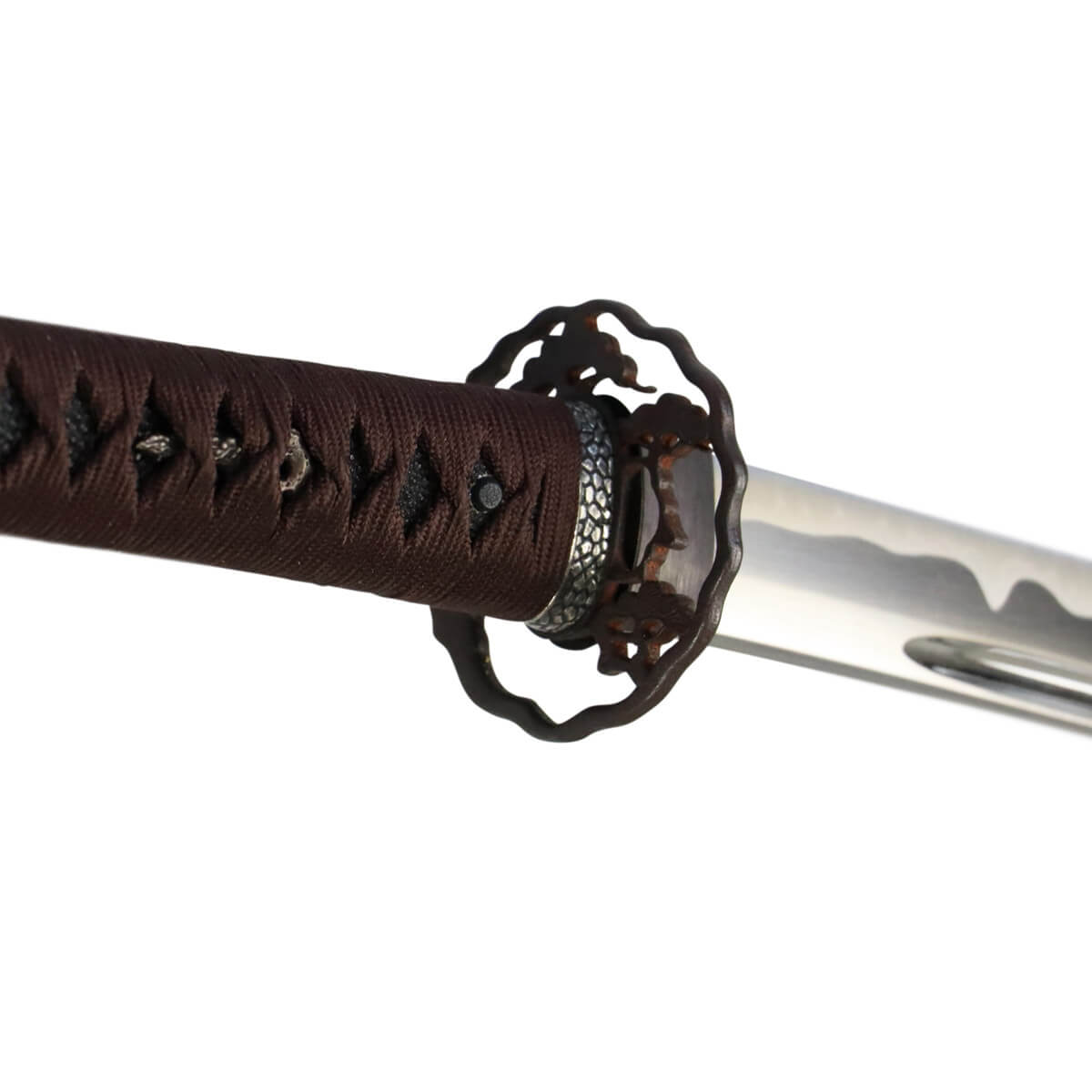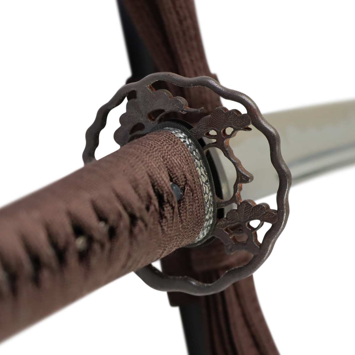 Die hochwertige Sukashi-Eisentsuba ist bis ins Detail filigran gearbeitet. Das typische Bild von einer Kiefer in der japanischen Kultur („Krüppelkiefer“) geben die Menuki wider. Die antike Optik rundet das Thema des Schwertes perfekt ab.