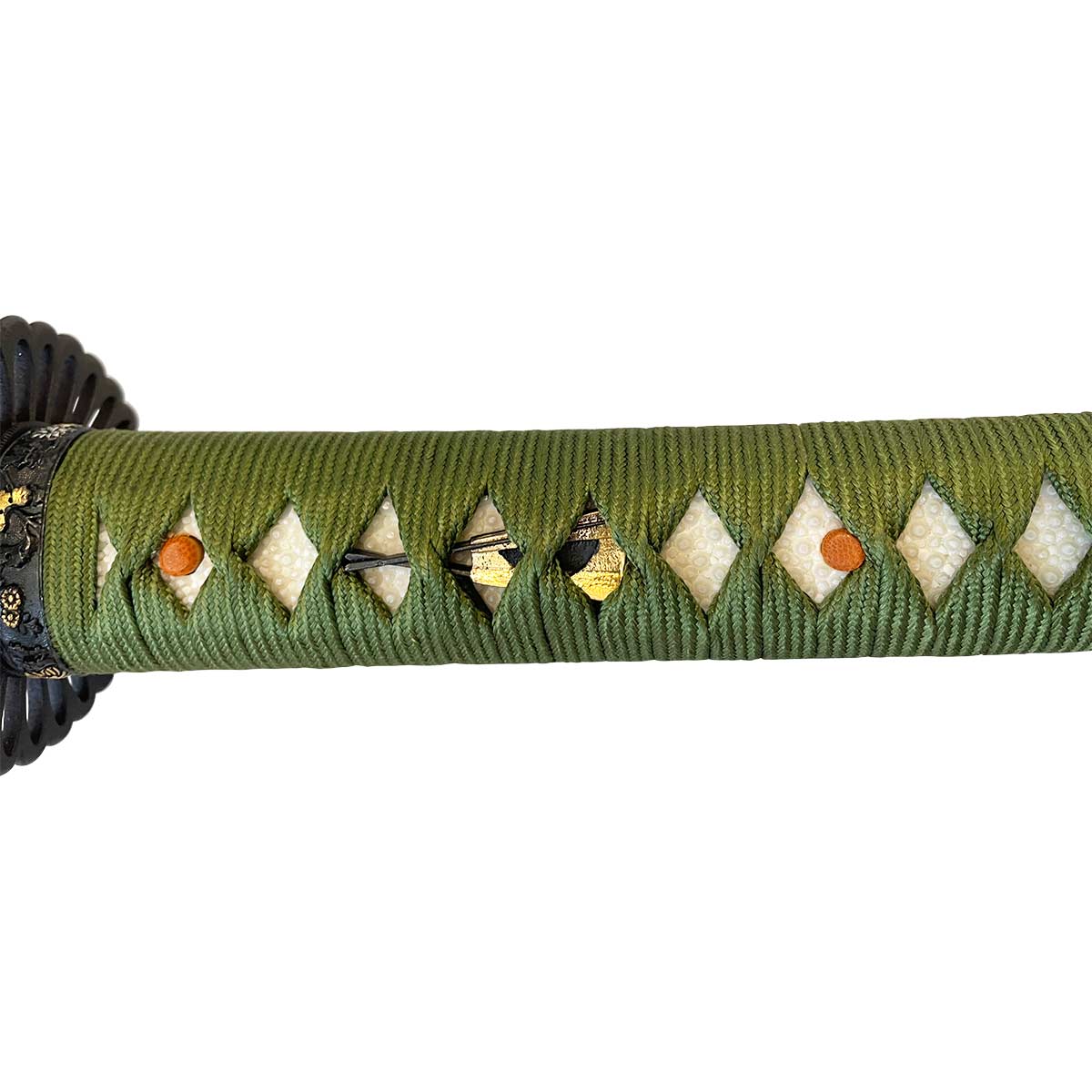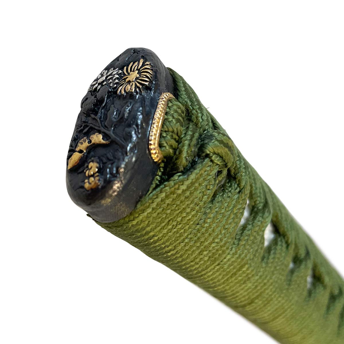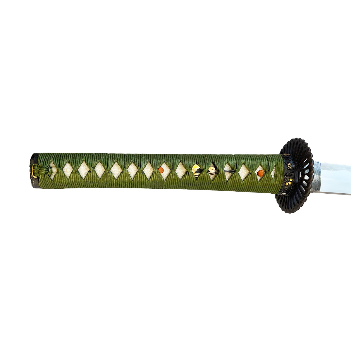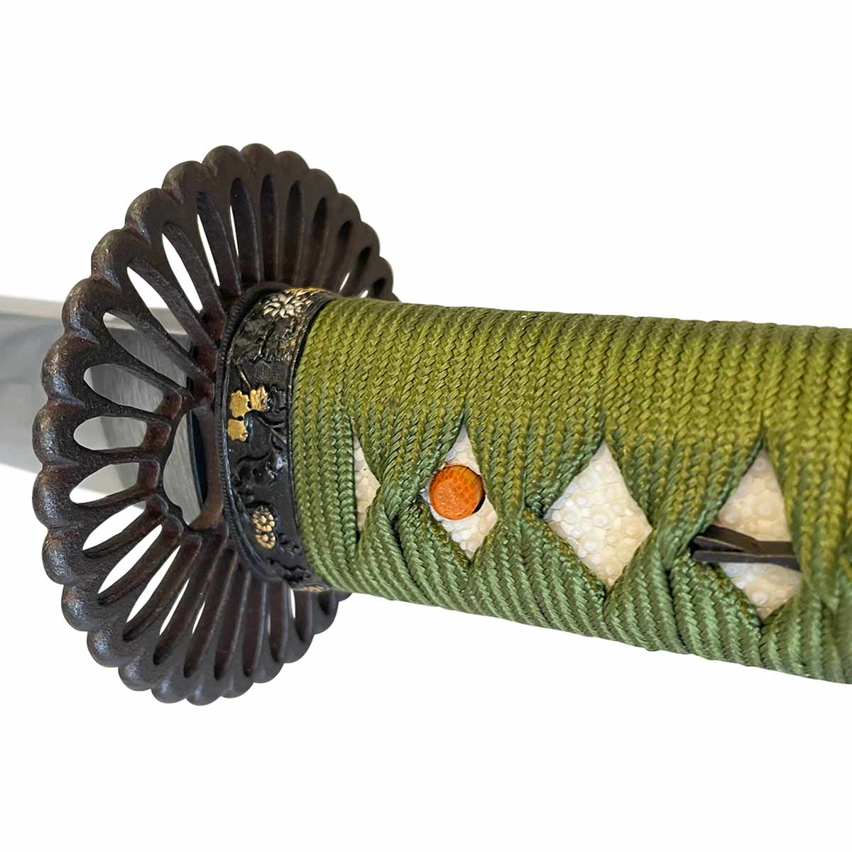 Die hochwertige Eisentsuba mit Antiquefinish stellt eine stilisierte Chrysanthemenblüte dar. Die Menuki sind als Fächer gestaltet.