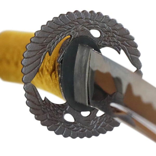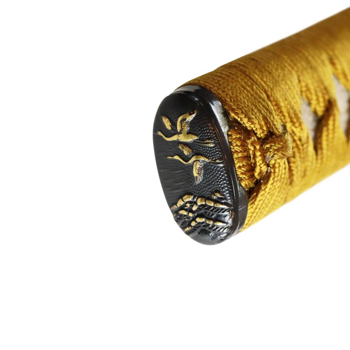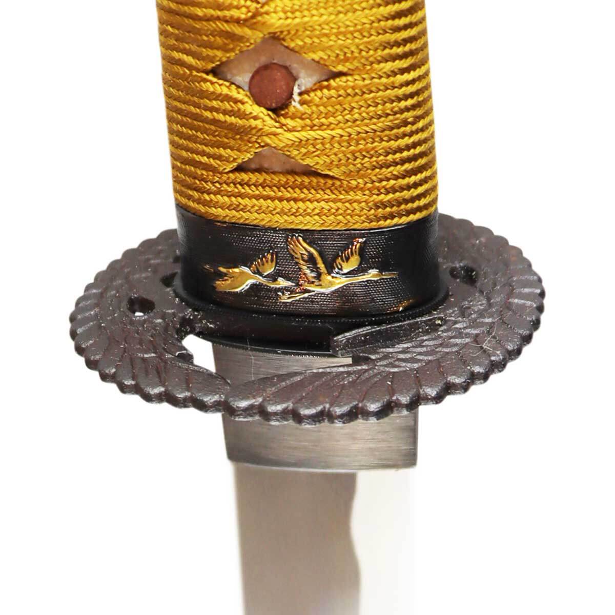 Das bestimmende Motiv ist der Kranich (Tsuru) der in Japan ein Glückssymbol ist. Die Kranichtsuba ist aus Eisen. Bei den Fuchi/Kashira sind die Motive goldfarben hervorgehoben.