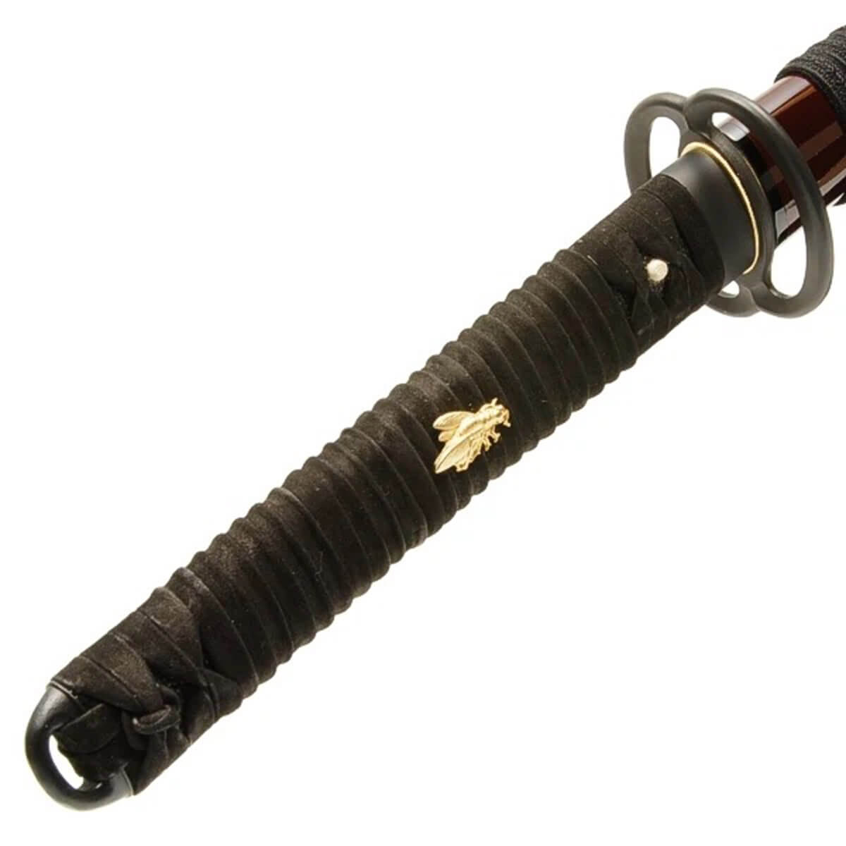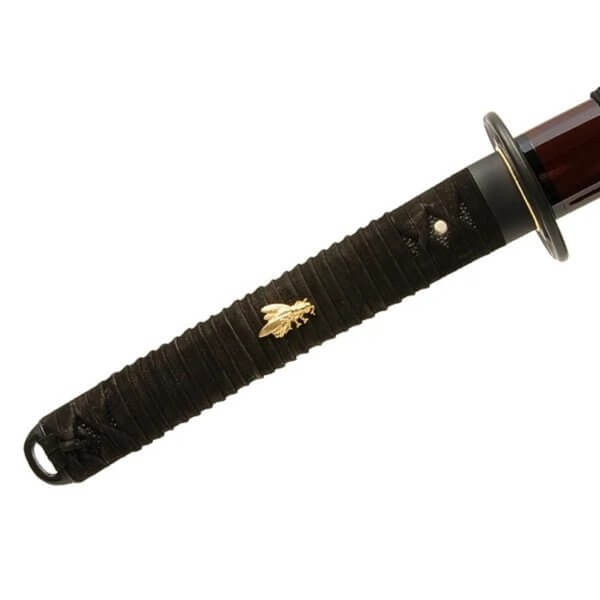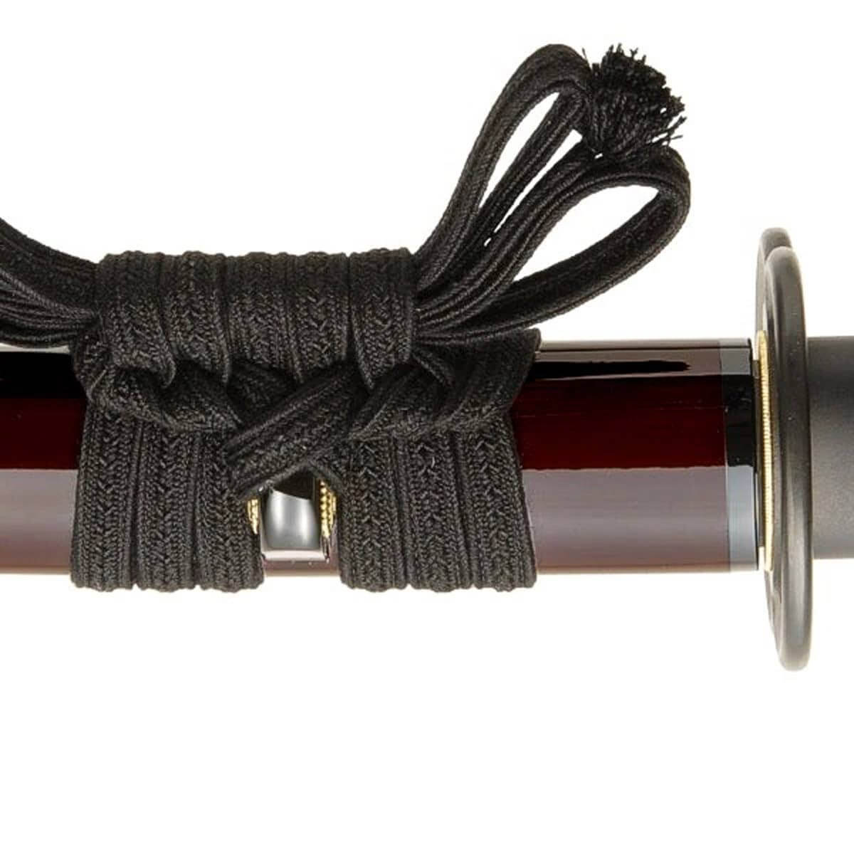 Die Montierung besitzt eine Griffwicklung aus schwarzem Wildleder in Gangi Maki gebunden. Mit außen liegenden Menuki. Selbstverständlich ist das Stichblatt die berühmte Musashi Tsuba und die Schwertscheide (Saya) ist dunkelrot glänzend lackiert mit Sageo aus Seide.
