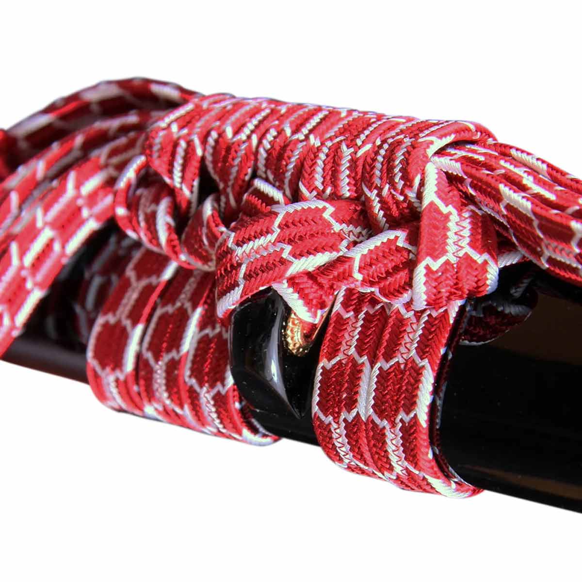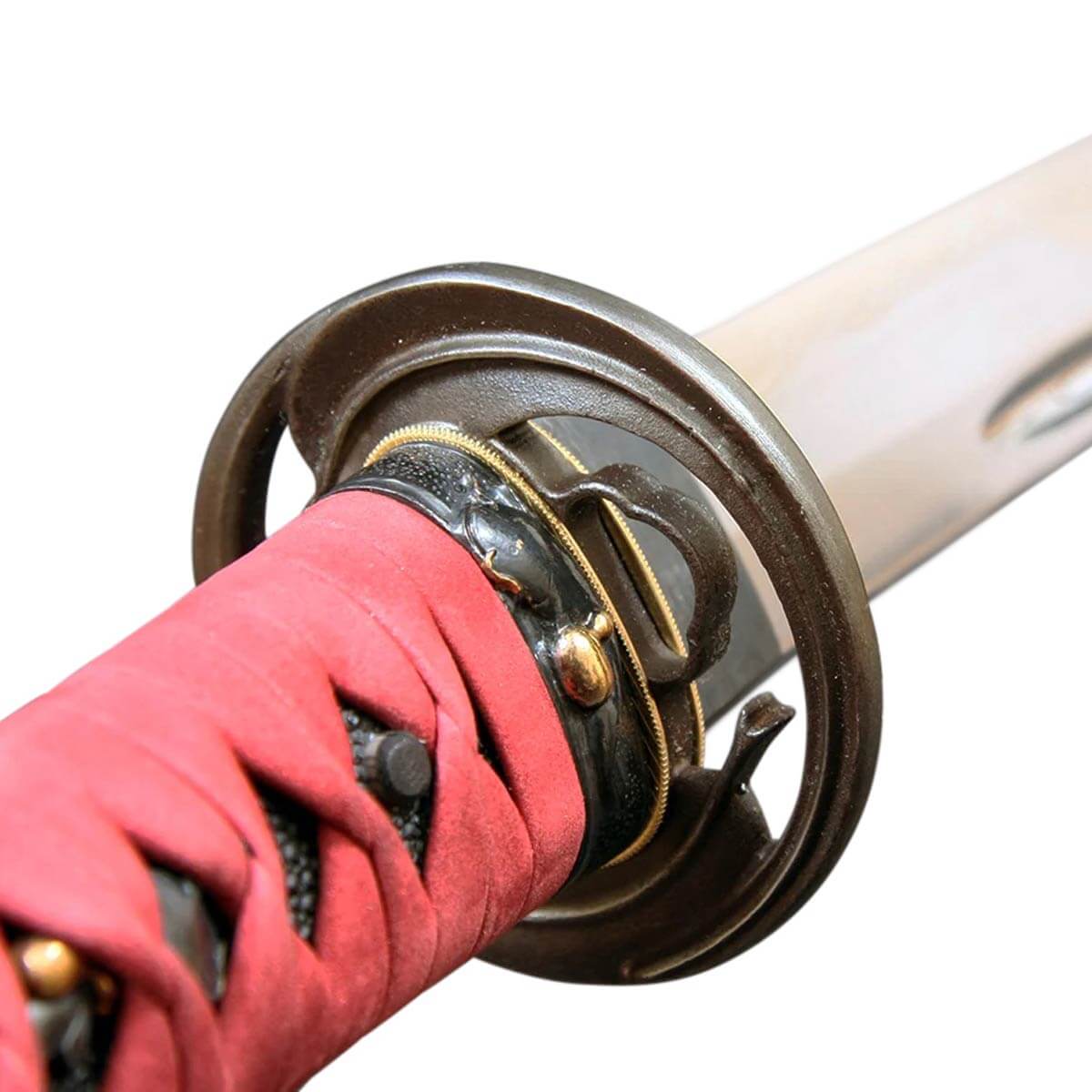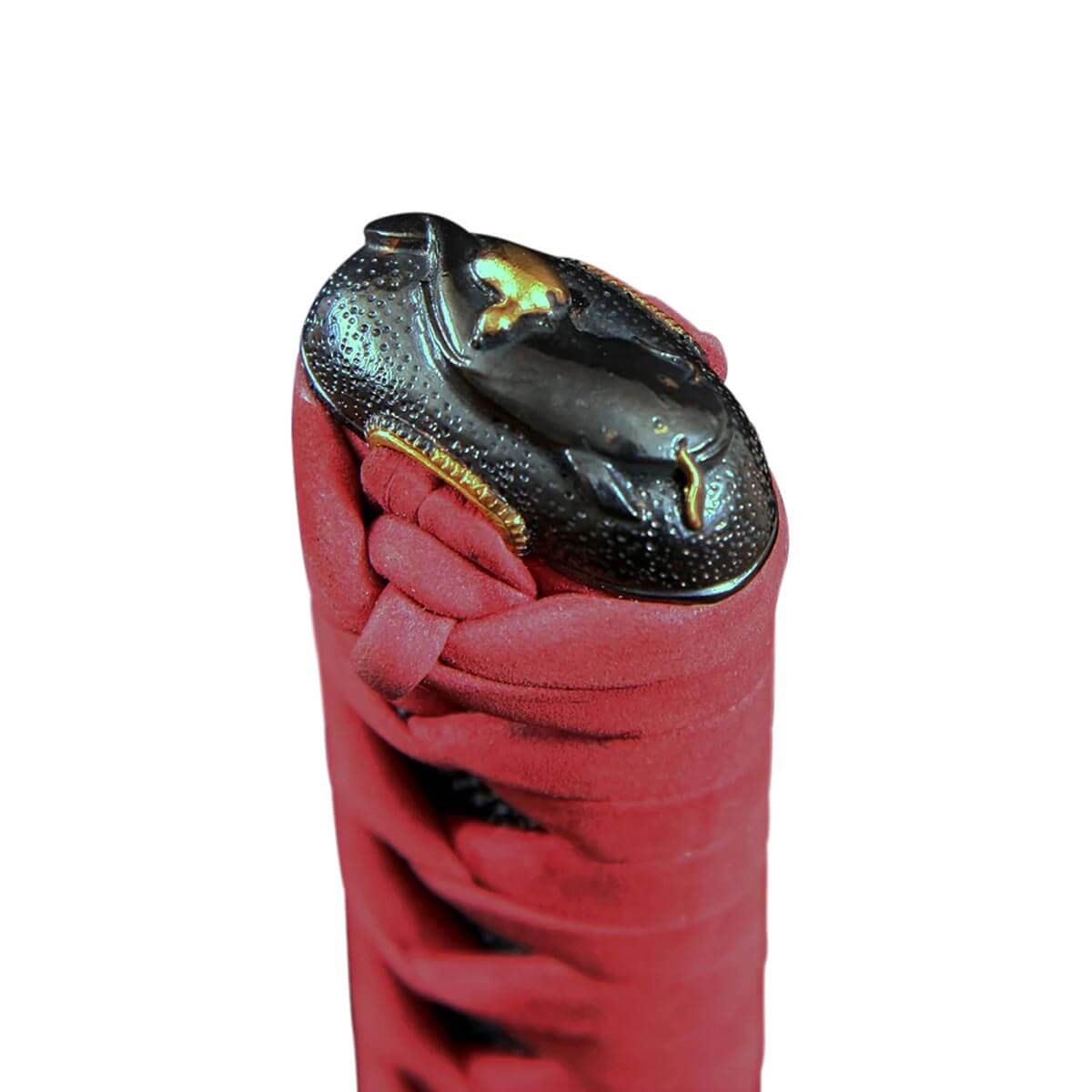 Die Montierung besteht aus einer schwarzen Schwertscheide mit rot weißem Kikko Sageo. Der Griff ist mit einem Band aus rotem Wildleder gebunden auf schwarzem Same.