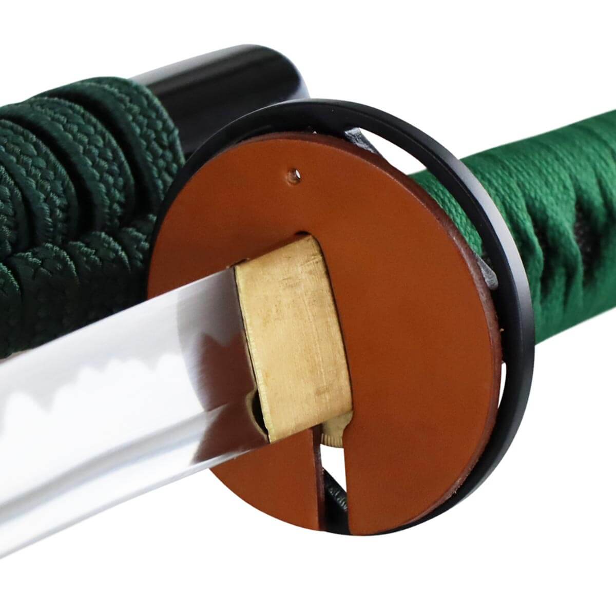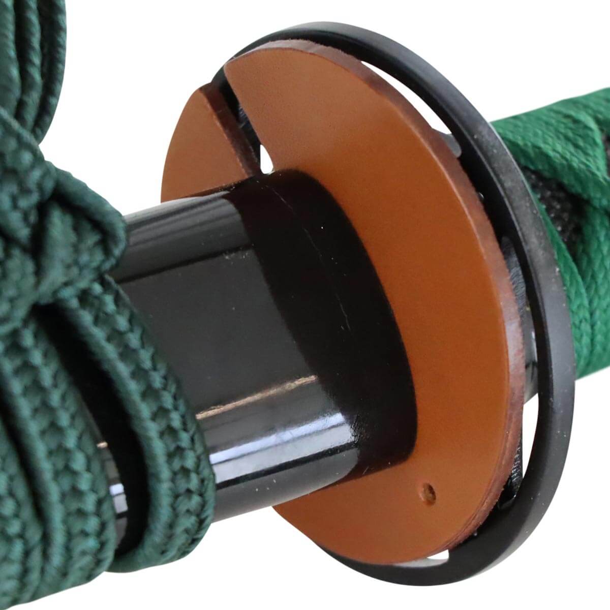 Diese Scheibe wird die zwischen Saya und Tsuba (und Seppa) platziert. Damit rutscht die Schwertscheide nicht komplett auf das Habaki und es besteht immer etwas Spielraum. Viele kennen diesen Schutzmechanismus wahrscheinlich von den Papier-Scheiben, die bei den meisten japanischen Iaito standardmäßig für den Transport zum Käufer verwendet werden.