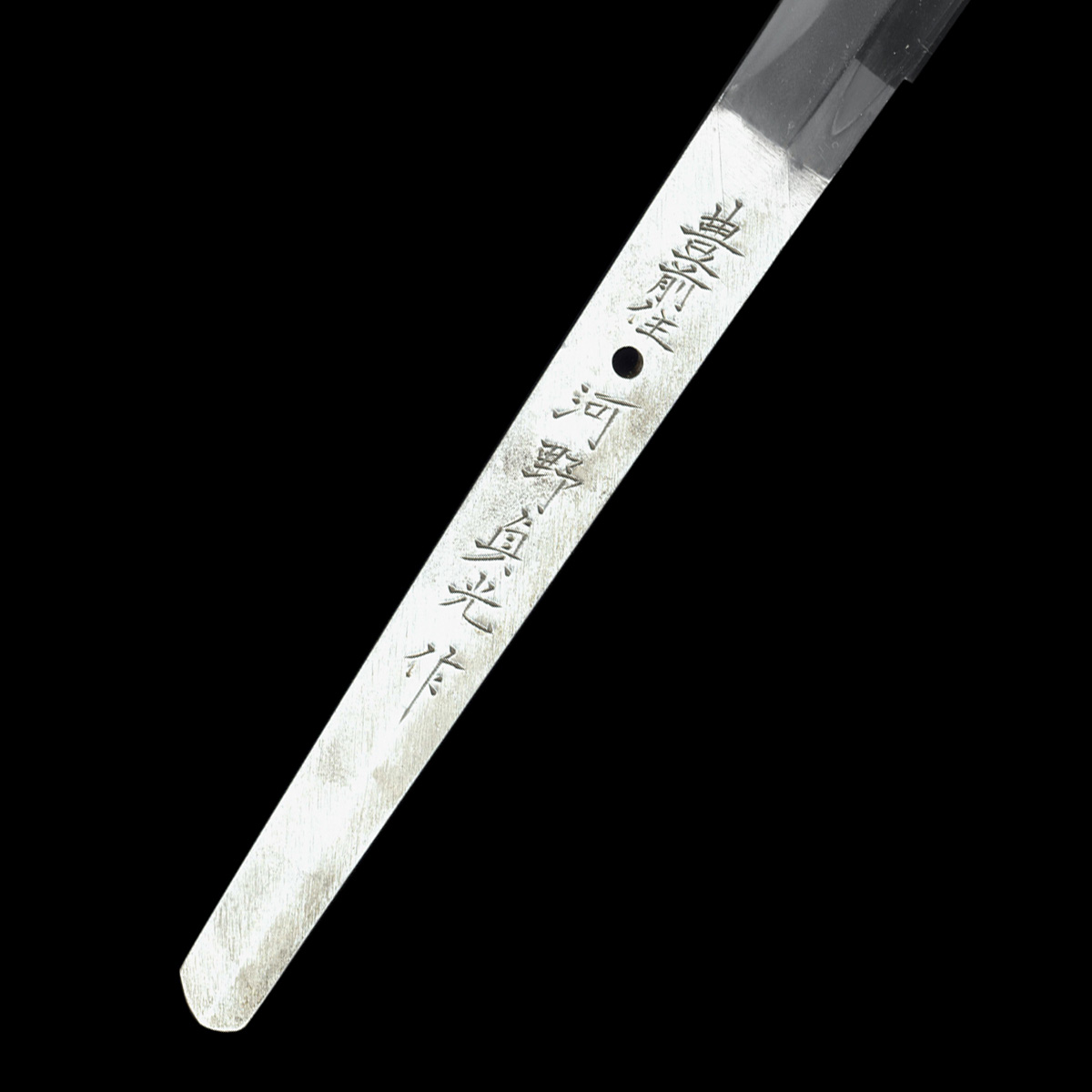 Omote: 豊前住河野貞光作 = Geschmiedet von Kōno Sadamitsu, ansässig in Buzen.