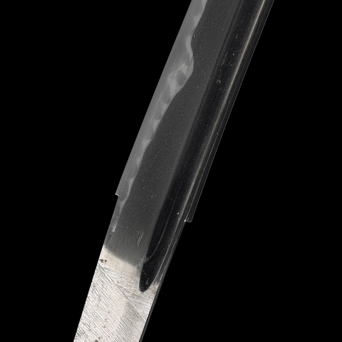 Das Hamon ist im Stil von Katayama Ichimonji Norifusa ausgeführt: eine nie-dominierte Struktur mit feinem Ko-nie, ein Gunome-Midare. Innerhalb der Schneide erscheinen zahlreiche charakteristische Mokume-Strukturen, die der Klinge große Lebendigkeit und Ausdruck verleihen.