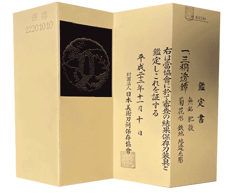In dem Umschlag befindet sich das NBTHK Hozon Zertifikat mit 3 Falzrändern. Diese Methode führt zu der alternativen Benennung als Origami für die Zertifikate. Ein Name, der bei uns auch im Zusammenhang mit der japanischen Kunst des Papierfaltens bekannt ist.