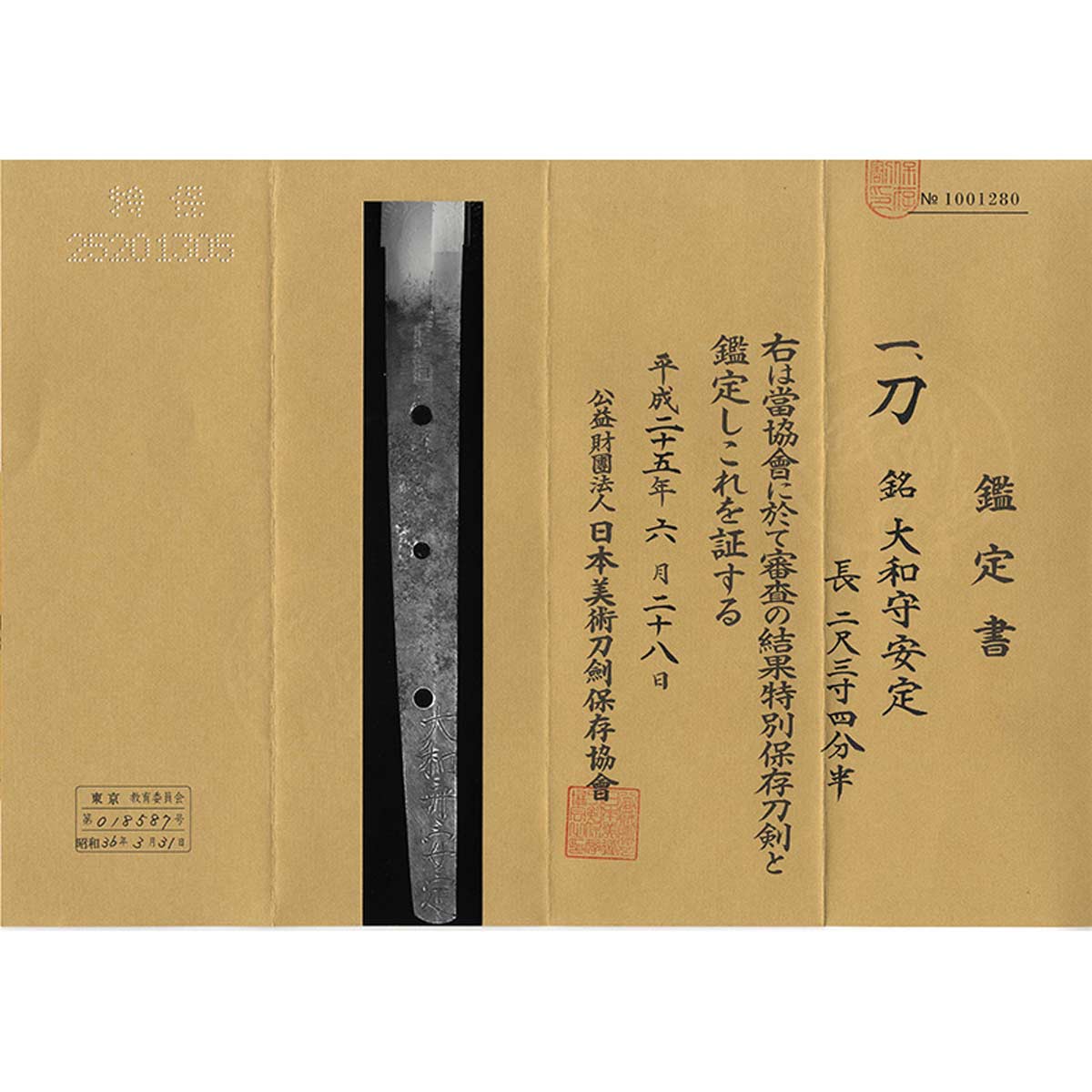Von der NBTHK wurde die Klinge als Tokubetsu (besonders erhaltenswert) eingestuft und es wurde ein entsprechendes Zertifikat ausgestellt.