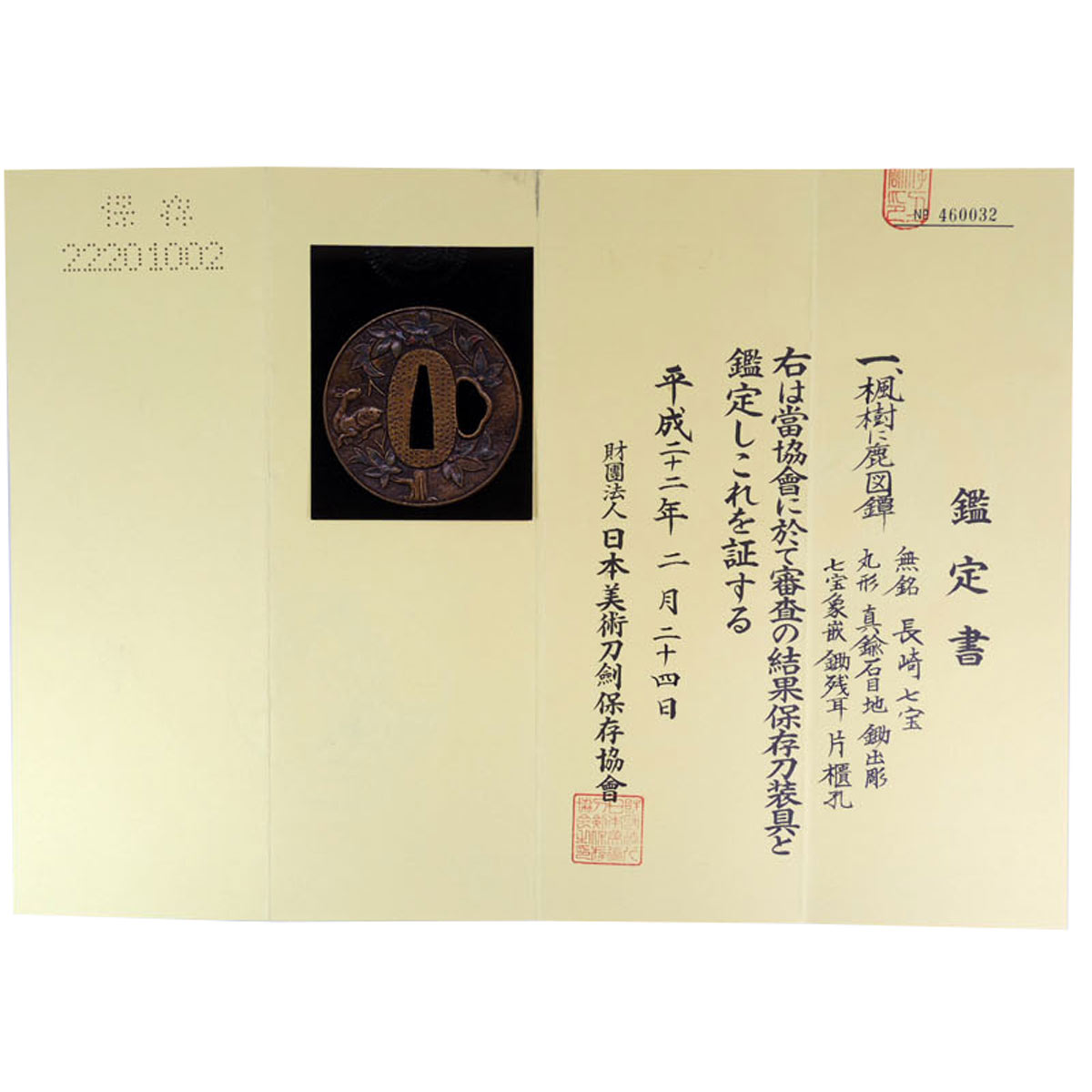 Dieses Exemplar besitzt Hozon Papiere der NBTHK, in denen der erhaltenswerte Status dieser Tsuba festgestellt wurde.