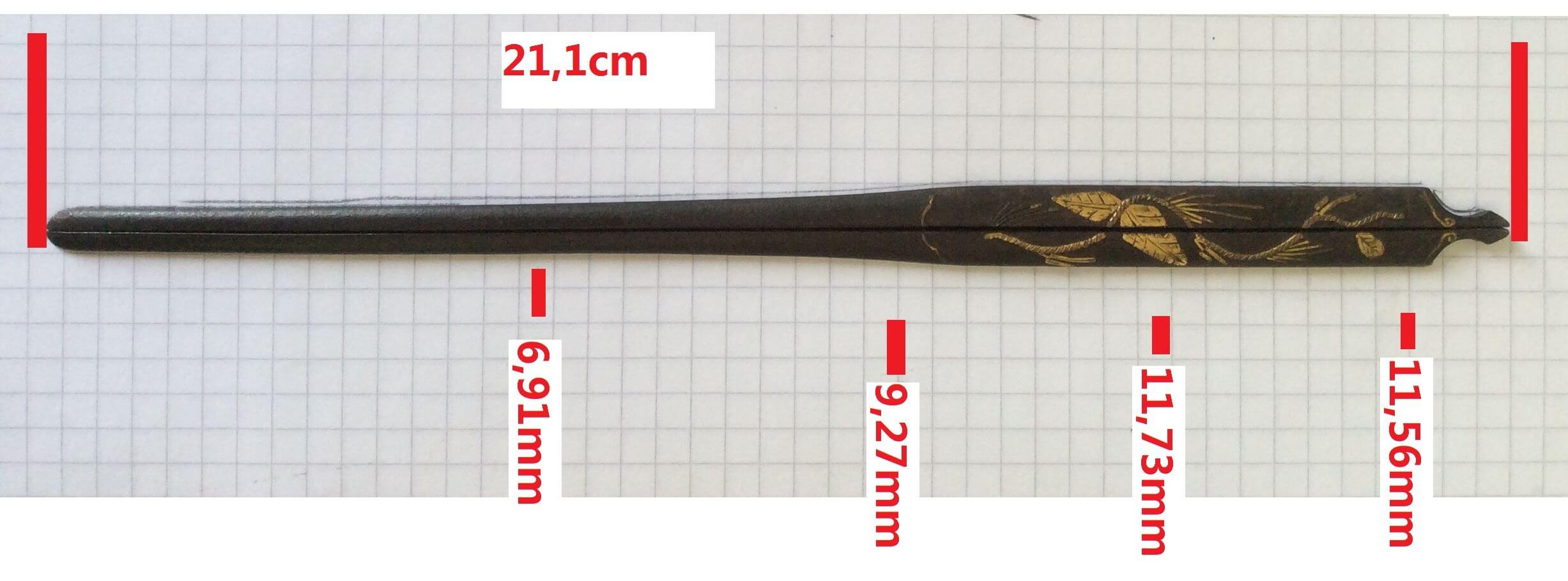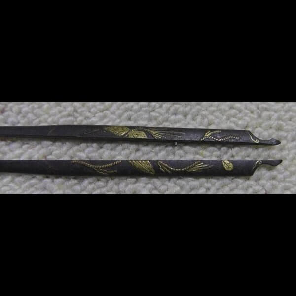Es handelt sich um 2 Stück, die Zusammen die Form eines Kogai haben. Diese Art der Kogai wurde von den Samurai als Essstäbchen genutzt.